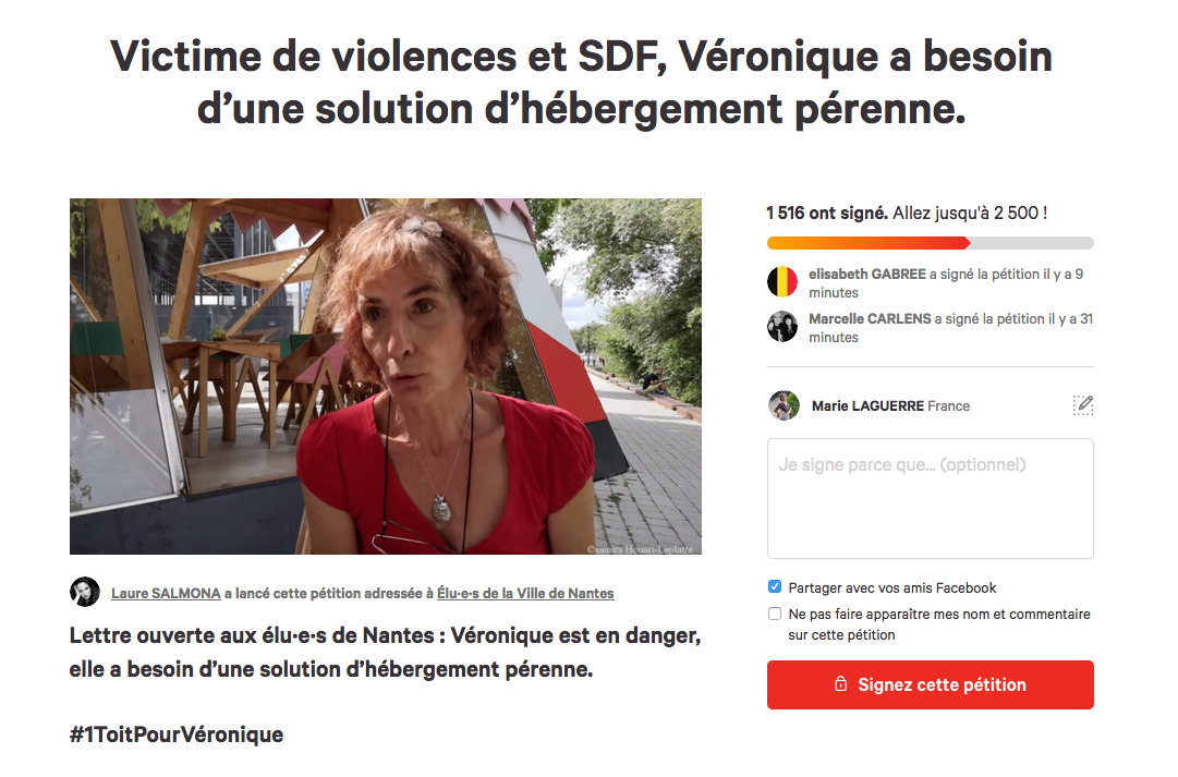 Une pétition demande à la ville de Nantes une solution d’hébergement pérenne pour Véronique, victime de violences conjugales et sans domicile fixe depuis 16 mois. Les femmes sans-abri sont particulièrement vulnérables et exposées aux violences sexuelles. Signez et partagez !